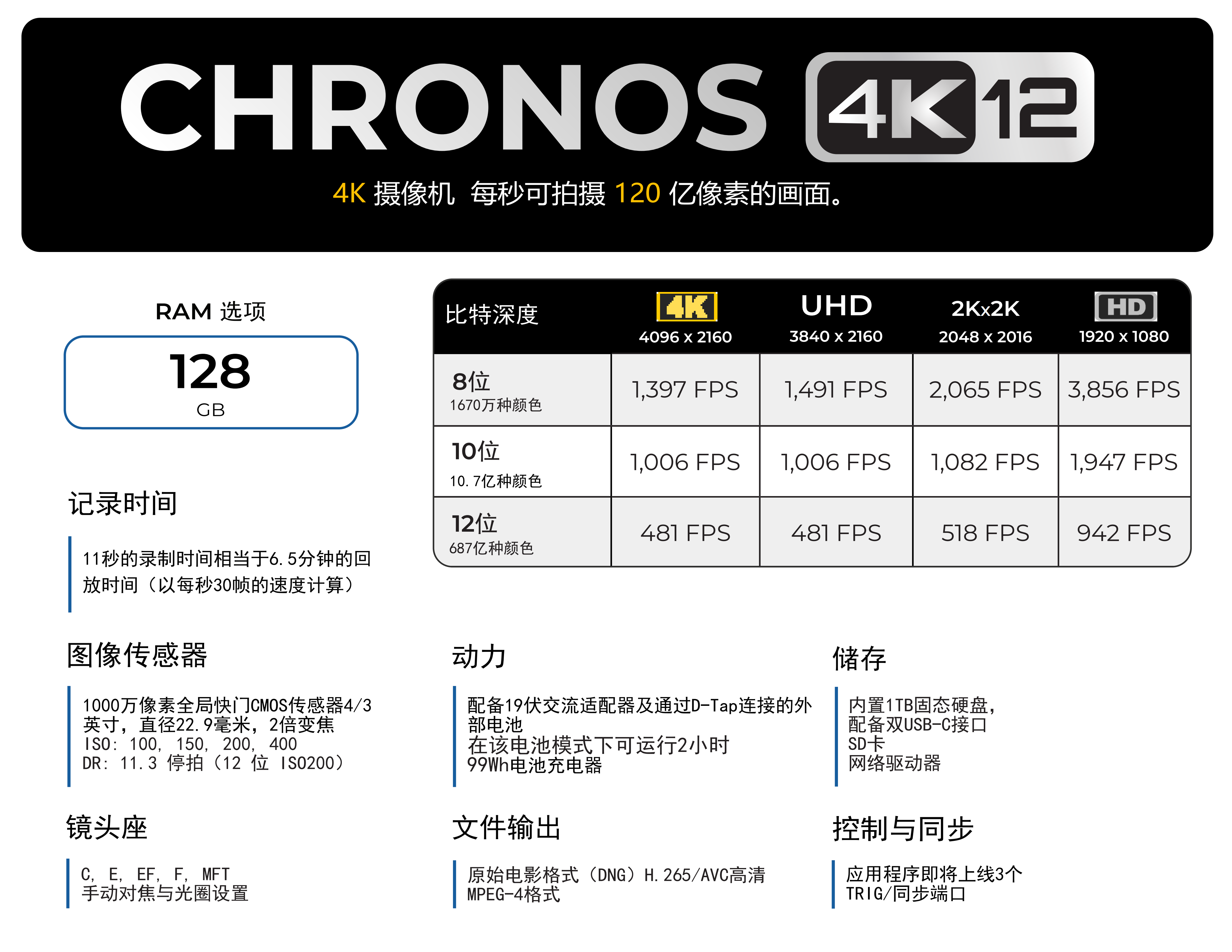 分辨率(4096x2160)下的拍摄时间为64GB:5.5秒、128GB:11秒。