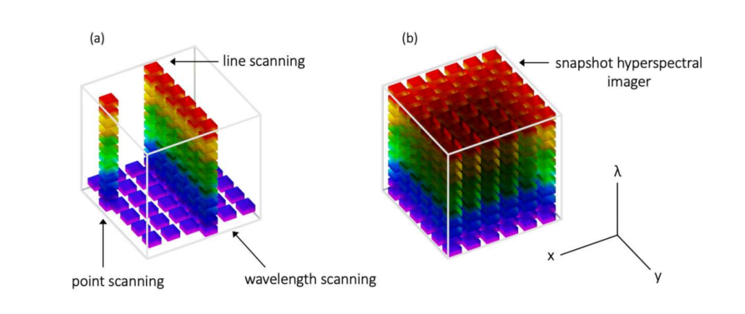 图1:(a)扫描式高光谱成像仪数据采集模式(b)快照式高光谱相机数据采集模式